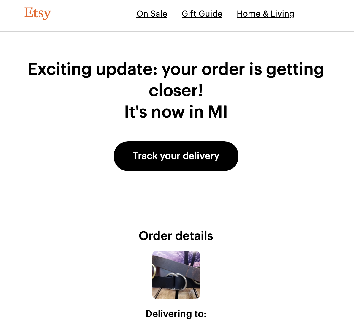 The update proactively builds anticipation the order is nearby and will shortly be in your mailbox.